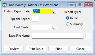 The Monthly Profit or Loss Report lists the total of transactions posted to each income and expense account. Like all other Financial Reports, this report is date sensitive, and can be printed for any past date for which there is data.