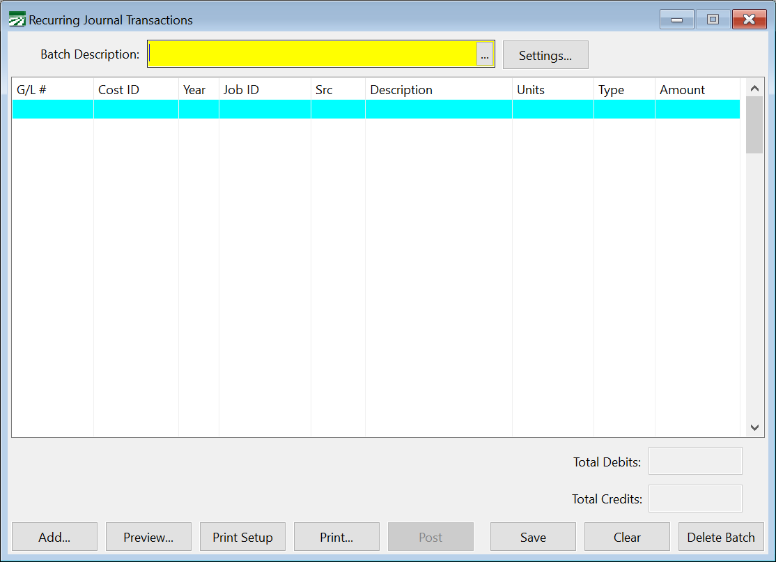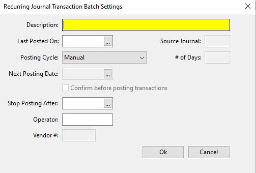 When you first open the window, it is ready for a new entry. If you want to edit an existing recurring batch, click on the lookup button or press [F4] on the Batch Description entry, and select an entry.