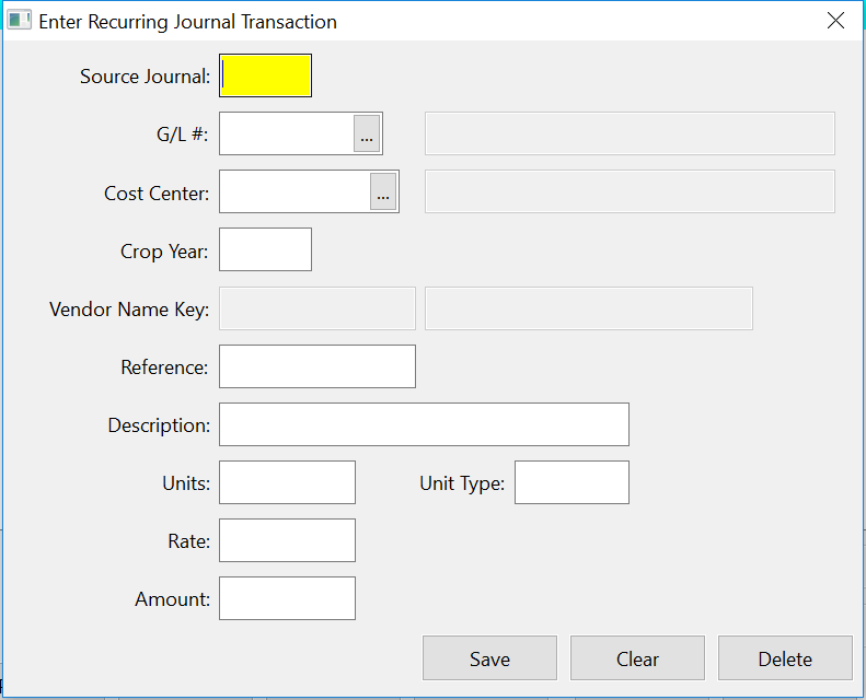 Enter a Source Journal code to use for your recurring journal entries. Example: JE (for Journal Entry), ADJ (Adjusting Entry), GJ (General Journal Entry). The Source Journal can be used later when printing transaction reports by Source Journal to distinguish your entries from transactions created by the program.
