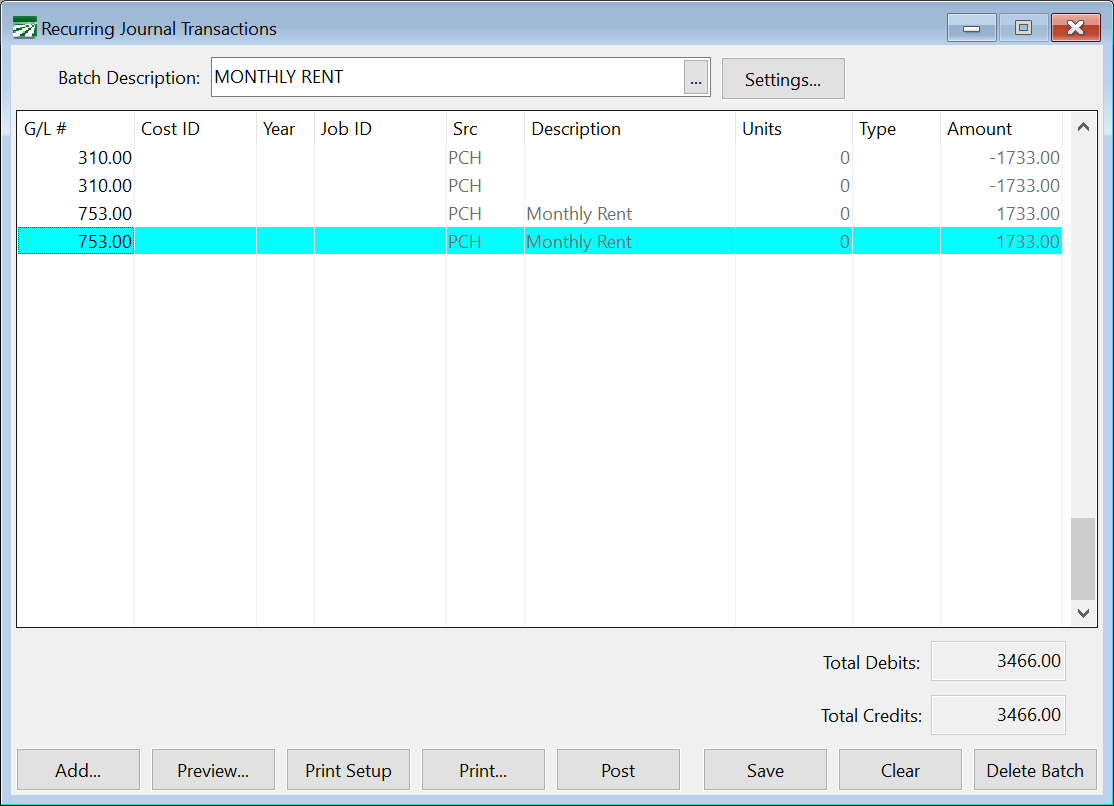 If you edit amounts on recurring payables transactions, pay attention to the total debits and credits. They must be in balance in order for the program to automatically post the batch.