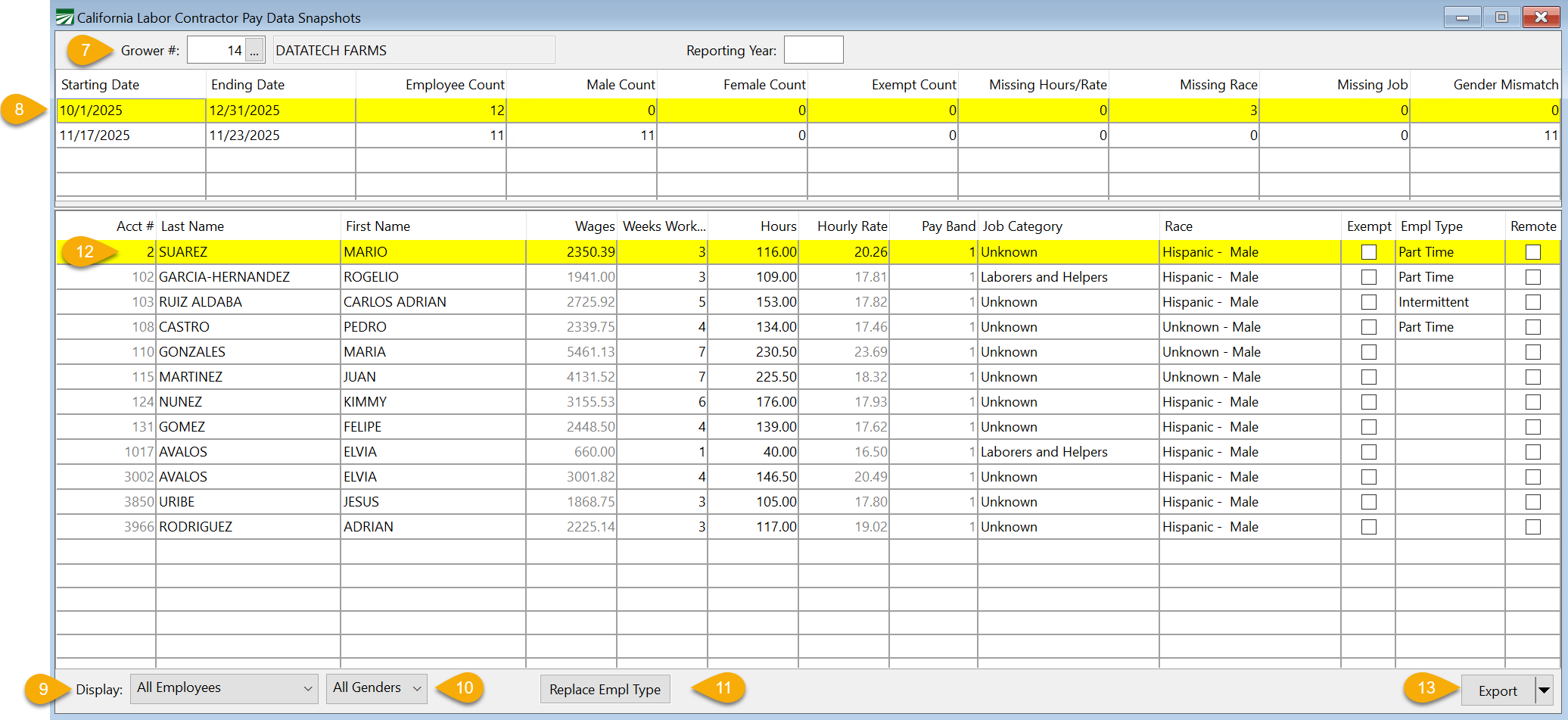 That is entirely up to you and your growers. The California Labor Contractor Pay Data Snapshots window shows all snapshot periods that you have compiled for a given grower. For each snapshot period, you can see various employee counts that give you an idea of how much information may need to be supplied or corrected before reporting. You may want to select snapshot periods that have fewer corrections to make.