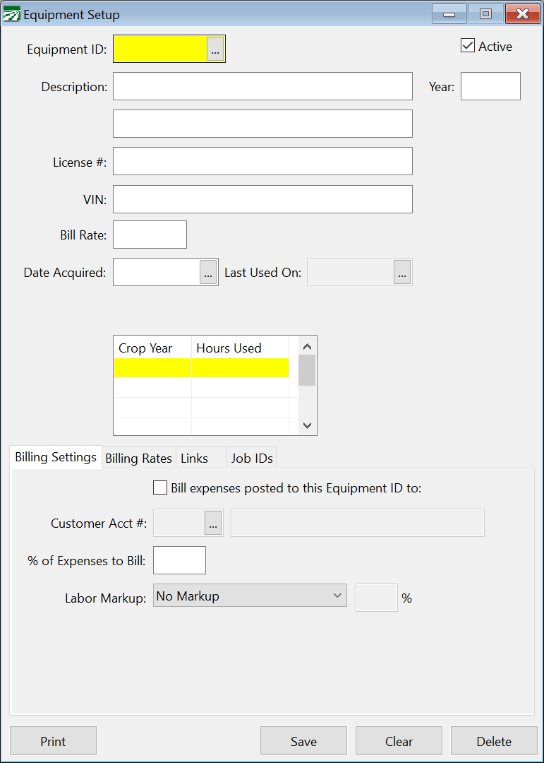 The equipment file can be used to keep track of equipment usage and to bill growers for equipment rental. You can enter an Equipment ID for each piece of equipment or for an equipment pool (i.e. a group of tractors). Each Equipment ID can have a separate billing rate. You can also enter billing rates on a table by job ID. This allows you to charge different rates for different tasks.