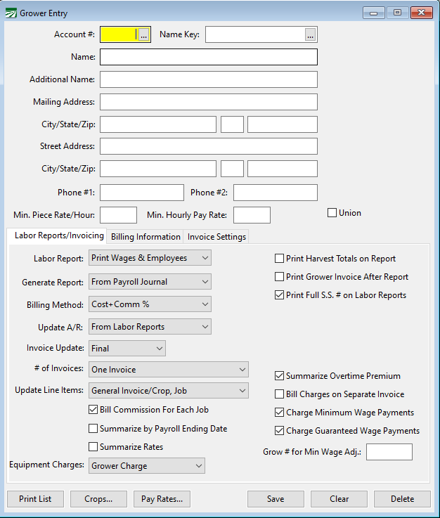 An account must be set up for each grower you perform work for. Each Grower account has settings which control how the grower is billed for labor.