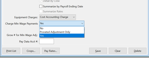 Note When Charge Min Wage Payments is set to No, the charge for minimum wage adjustments will be created with a zero for the grower number.