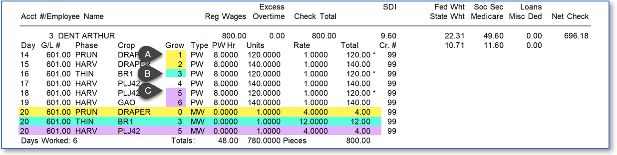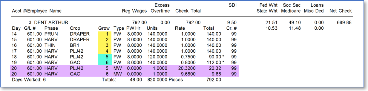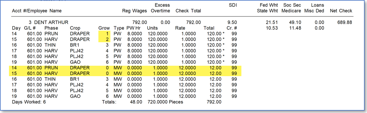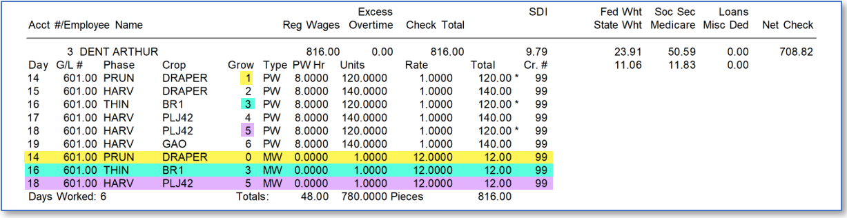 Notice the minimum wage adjustment lines created for Growers 1 and 2do not have a grower number. Remember, in this example Growers 1 and 2 have their Charge Min Wage Payments option set to No. As a result, these lines will not be billed to these growers. Also, because the employee earned the same amount each day, the adjustment needed for each day is exactly the same.
