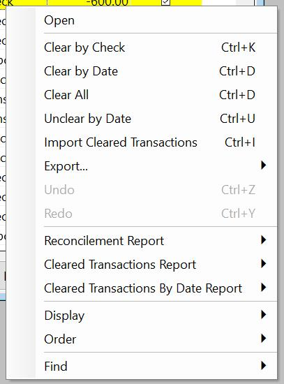 You can right-click on any item within the Bank Reconcilement grid to activate a pop-up menu with additional options.