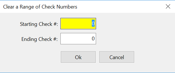 You can clear a block of checks by clicking on the Clear by Check # button at the bottom left of the window. When you click on this button, a window will appear for you to enter the starting and ending check #'s: