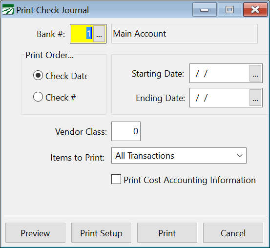 The Check Journal is a list of checks that have been entered into the accounting system. A separate Check Journal is printed for each bank account. This report, while not required, can be printed so that you have a physical printout of check entries. Some companies print the Check Journal at the end of each month to retain as a permanent paper record.