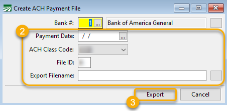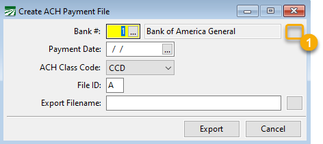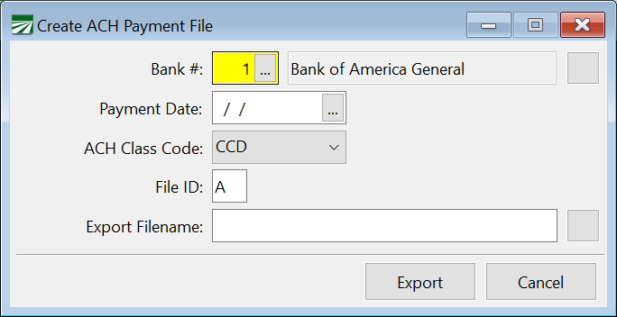 Enter the Payment Date, ACH Class Code, and the File ID. Select where you want to save the Payment File and its name in the Export Filename entry.