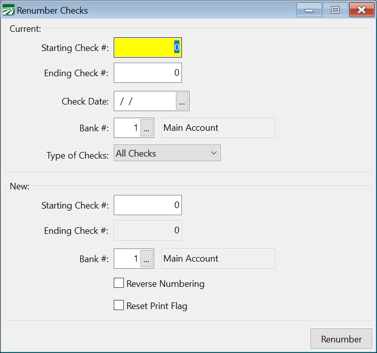 If you are trying to fix this situation, enter the last check # in the New Starting Check # entry and then select Reverse Numbering. This changes the New Ending Check # to match the Current Starting Check #.