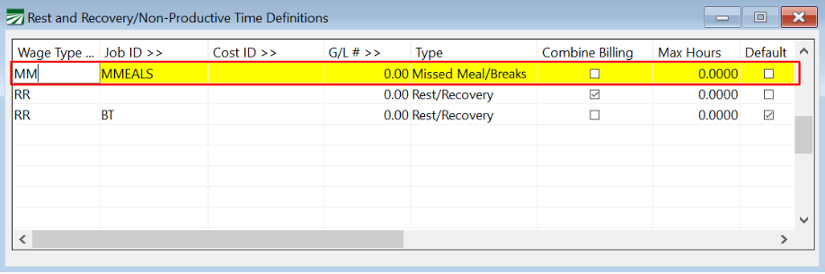 Next, you will need to add this new pay type to the Rest and Recovery/Non-Productive Time Definitions grid. The program uses these entries to determine which line items on the check are designated as missing meal/breaks. Then, the program can update those lines with the appropriate pay rate.