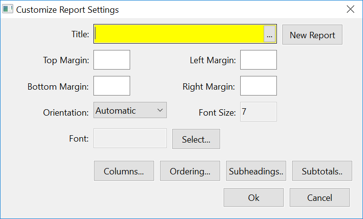 Click on the Customize button to add columns to your report. This option is designed to save your selections when you give the program a title for the report that you are setting up. You can set up and save multiple reports definitions. At the present time, the report definition only includes the ordering and column information. In the future, you will be able to customize report settings for sub-headings and sub-totals.