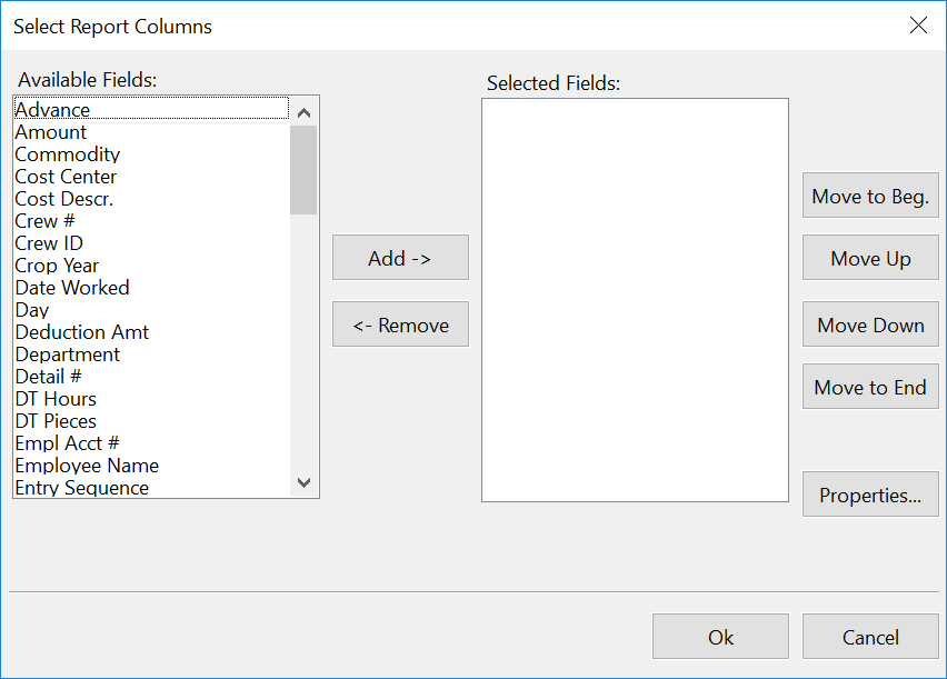 If you want to change the order of the fields in the selected list, highlight a field in the list and then click on the Move Up, Move Down, Move to Beg., or Move to End buttons.