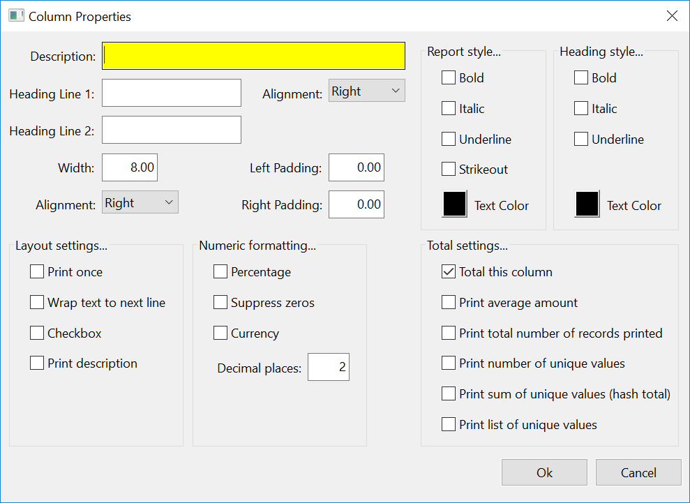 Click on the Properties button to edit the settings for the currently selected column. In the Properties window you can control the appearance of each column on the report. The following window will appear: