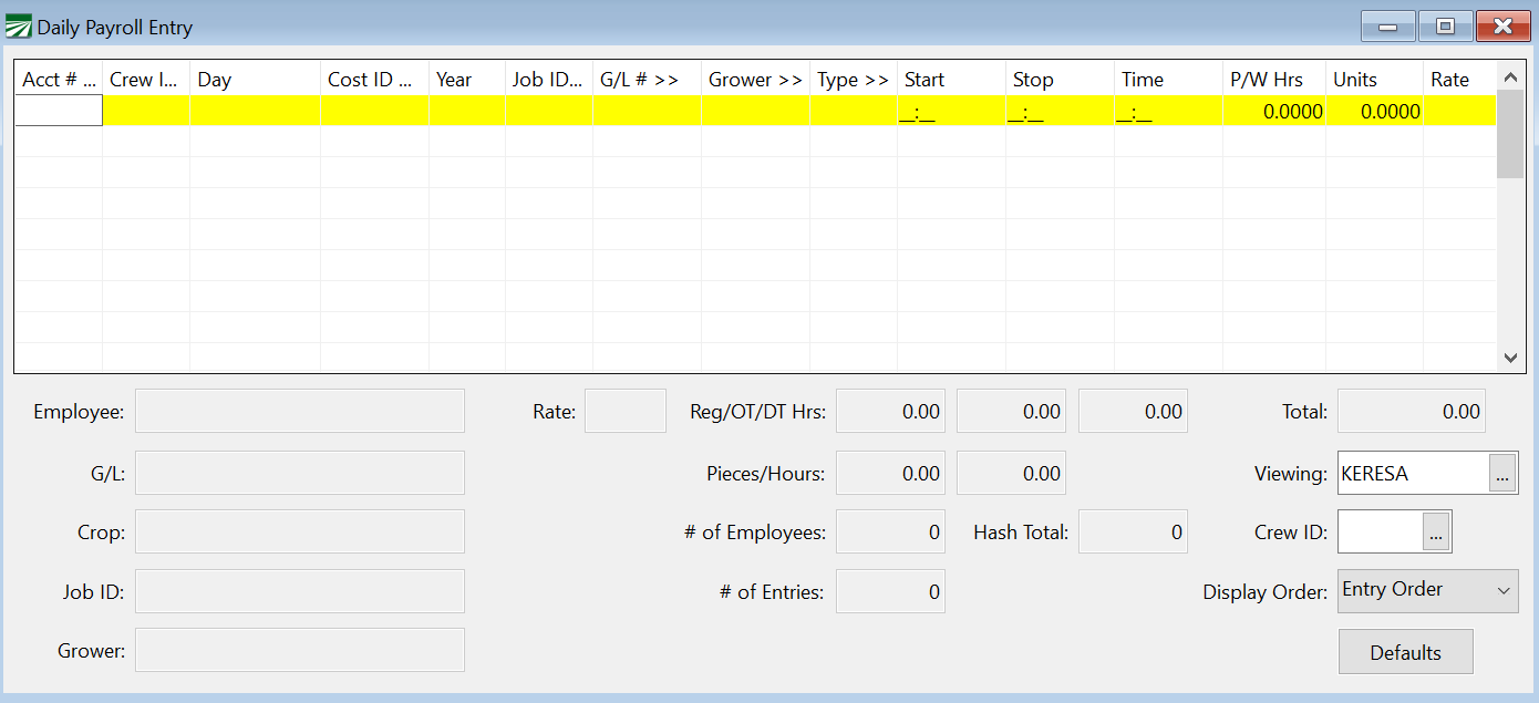 If all entries will be using the same Crew, General Ledger #, Cost Center, Wage Type, Hours, Units, or Rates, you can set up defaults that will automatically enter these on each line to speed up the daily entry process. Click Defaults at the bottom of the window to set the defaults.