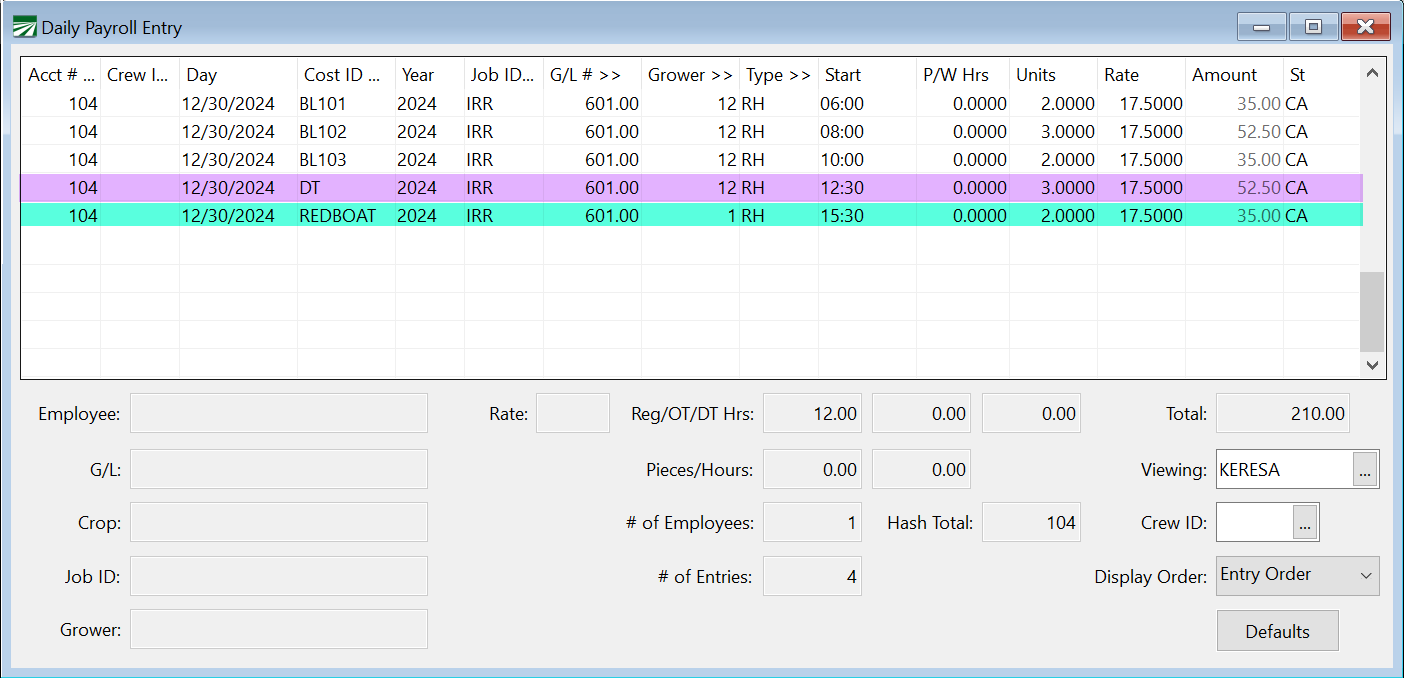 You should not enter new lines when you are viewing someone else’s entries. As soon as you finish entering new lines or click on another line, the grid will be refreshed. The program checks each entry that is displayed to make sure the username for those entries matches the username entered at the bottom of the window. The entries you just made will disappear because they were saved with your operator’s name, but you are currently viewing another operator’s entries. The entries are still in the Daily Payroll file. To view them, just enter your operator name in the Viewing entry.
