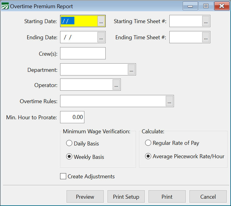 The Overtime Premium Report can be used to calculate the number of overtime hours each employee should be paid, calculate the employees’ Regular Rate of Pay, and create overtime premium line items in the Daily Payroll file to pay employees the overtime/double-time premium amounts.