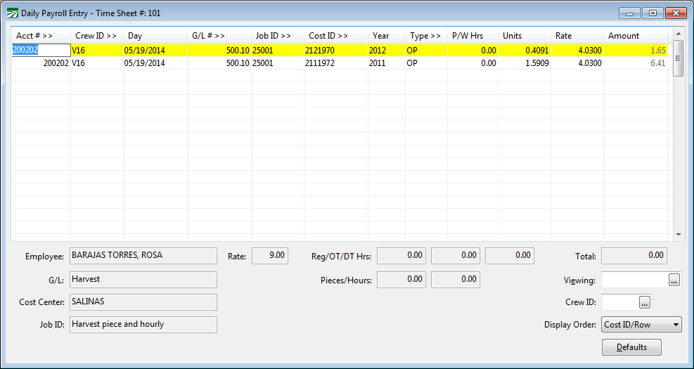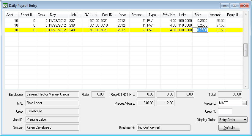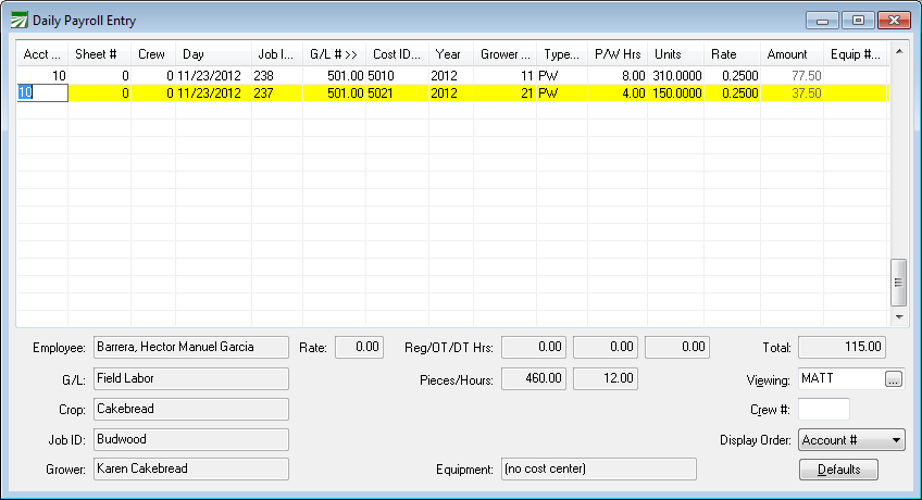 Why create two line items? Since the start and stop times are not entered, the program has no way of knowing which crop/job/grower “should” be charged for the overtime. Therefore it allocates the overtime hours proportionally based on the hours worked on each line item.