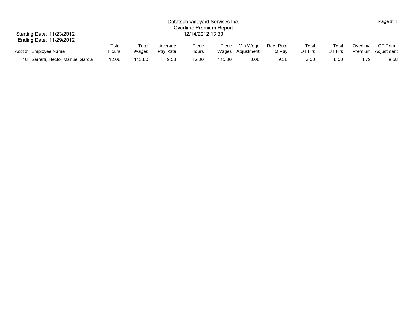 In total, the employee shown above worked 12 hours in one day for two different Growers, Crop ID’s and Job ID’s, with different piece rates and effective hourly rates on each line. There is a 10 hour limit before paying overtime for field labor, so when the Overtime Premium Report is run, it shows two hours of overtime should be paid to the employee:
