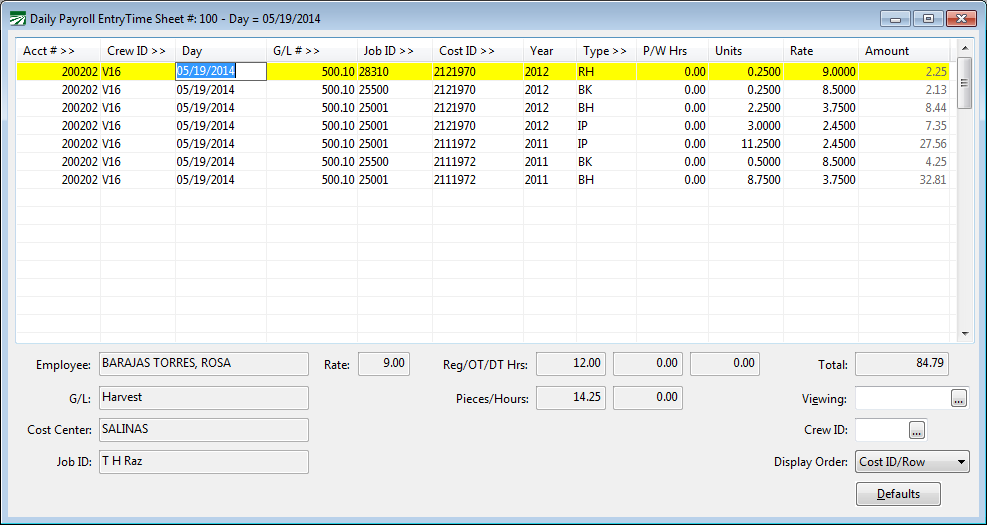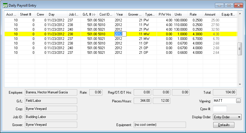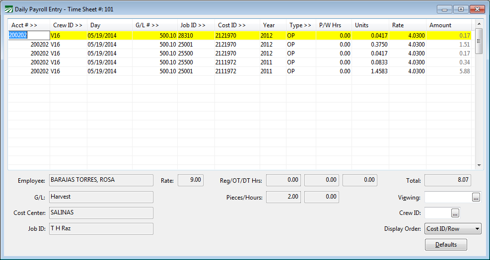 Normally the Overtime Premium Report will pro-rate the overtime hours across all of the line items on each day, so that the overtime will be applied proportionally to each Cost ID, Job Code, G/L # and Grower used. Here is an example of line items on one day with five different hour amounts: