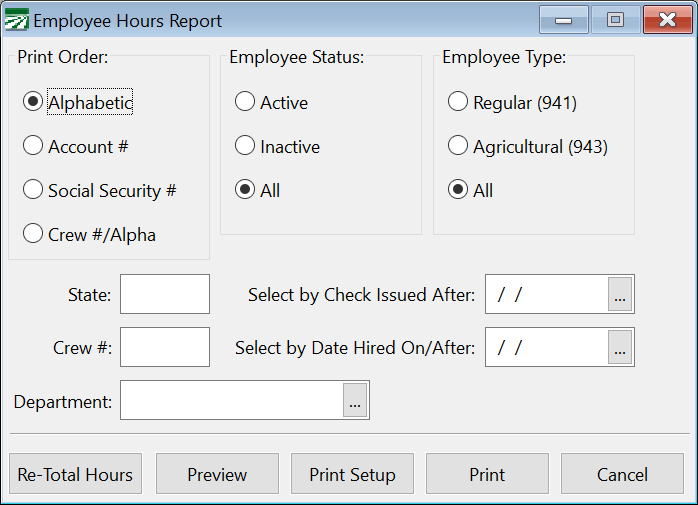 Before running this report for the first time, click on the Re-Total Hrs button at the bottom left corner of the window. This will add up the hours worked on all checks for all employees both for Year-To-Date and lifetime. This is necessary because previous versions of the payroll program did not maintain these hour accumulators.