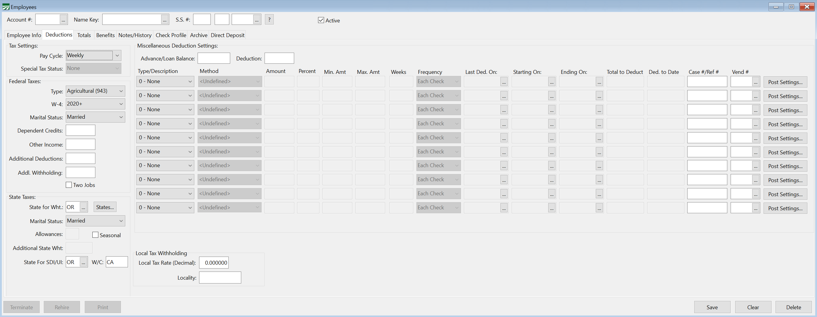 This tab page contains the settings for calculating federal and state tax deductions as well as miscellaneous deductions (for advances, child support, health insurance, garnishments, etc.)