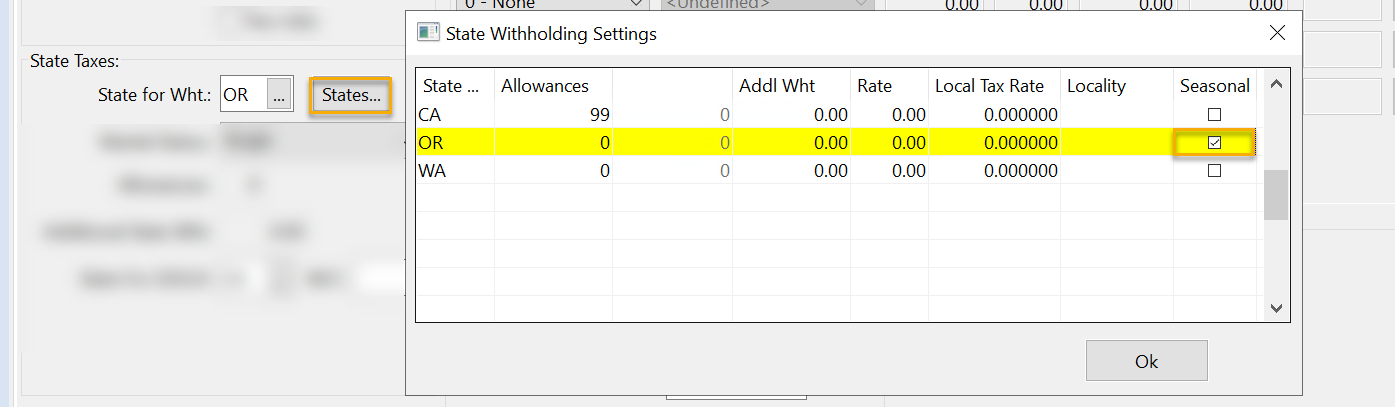 If you are a multi-state employer and the employee is a seasonal worker, you must mark them as seasonal in the specific state where they work. To do this, click States, then in the State Withholding Settings window that opens, and select Seasonal for the applicable state.