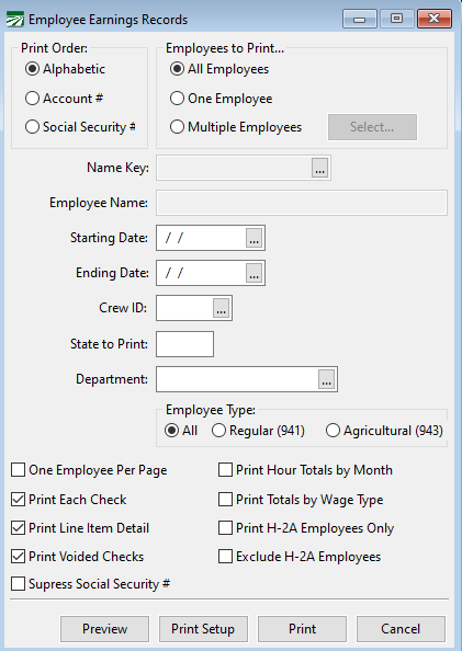 Leave this entry blank to print all employees or enter the two-letter abbreviation of the state you want to print. The report selects employees based on the State for Withholding entry, not the state in the employees’ mailing address.