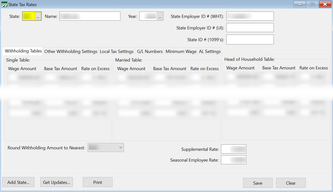 The State Tax Rate file keeps track of state taxes for each year that you have payroll records. In addition, if your company employs workers in multiple states, this file can keep track of different tax rates and tables for each state.