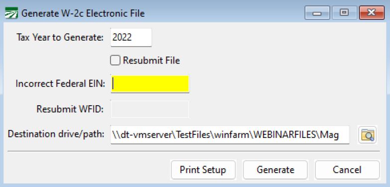 Enter the Tax Year to Generate and click Generate. If you are sending a correction file due to an incorrect Federal EIN, you can enter the incorrect number and then generate.
