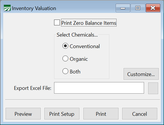 To print the Inventory Valuation Report, click on the Print Valuation button at the bottom of the Chemical window.