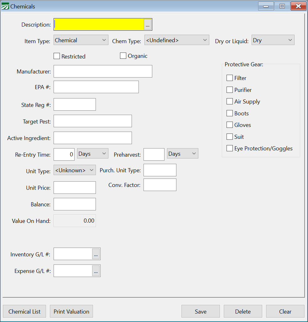 Each chemical that you use must be entered in the Chemical file before you can enter it on an application. In addition to information needed for reporting purposes, the chemical file can also maintain balances on hand for each chemical as well as cost per unit for each chemical.