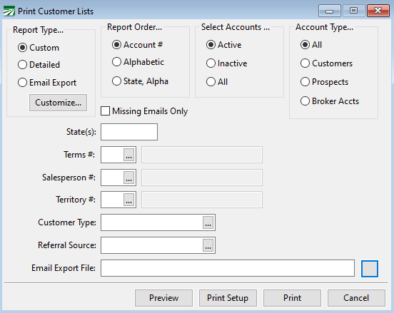 State(s) / Terms # / Salesperson # / Territory # / Customer Type / Referral Source
