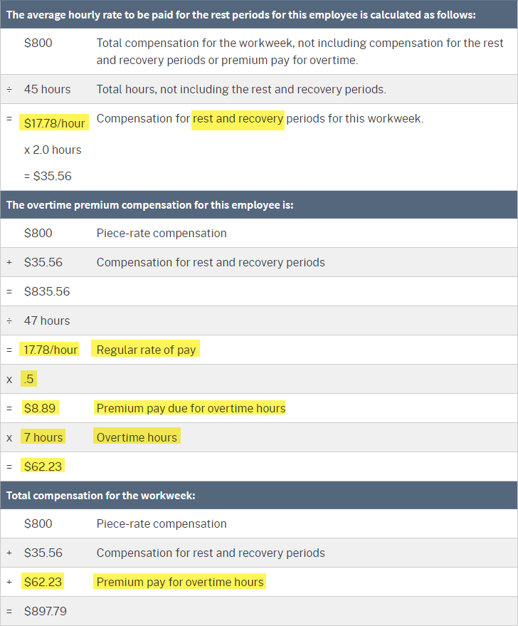 It would be beneficial to make sure your supervisors and employees are aware of how overtime will be paid before they engage in the work. The following example (from the California Department of Industrial Relations FAQ’s Piece-Rate Compensation) shows the calculation with rest and recovery and overtime; you might consider showing it your employees to help them understand how the calculations are done. The example is provided in both English and Spanish.