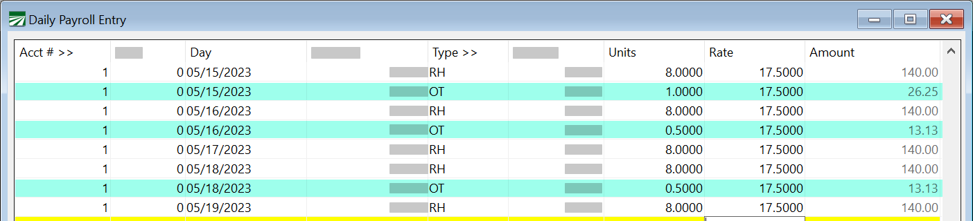 Then you would enter RH, the Regular Hourly Wage Type, for all entries. The overtime for Hourly only wages will be paid out at 1 ½ x the hourly rate. The Rate column will show the employee’s regular hourly rate. The Overtime and Double-time rates will appear on the employee’s check and reports.