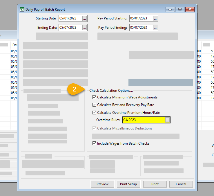 In the Daily Payroll Batch Report window, enter your Starting/Ending Dates as well as your Pay Period Dates. Then in the Check Calculation Options section, select
