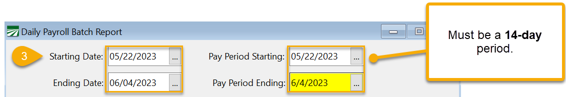 After entering your payroll in Daily Payroll Entry, double-check that you only have lines with dates within the 14-day period. If you have checks from previous pay periods that need to be issued, you should issue a separate check.