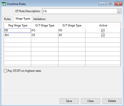 The table under the Wage Types tab allows you to link one Wage Type to a corresponding Overtime and Double-time code. This may be used if you have more than one overtime/double-time wage type.