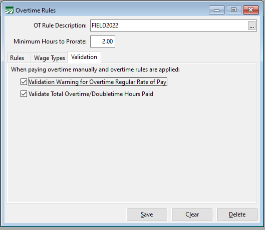 The Validation tab allows you to turn off warnings on the Daily Payroll Batch Report when you have manually entered OT and have selected to Calculate Overtime Premium. We recommend leaving these options on.