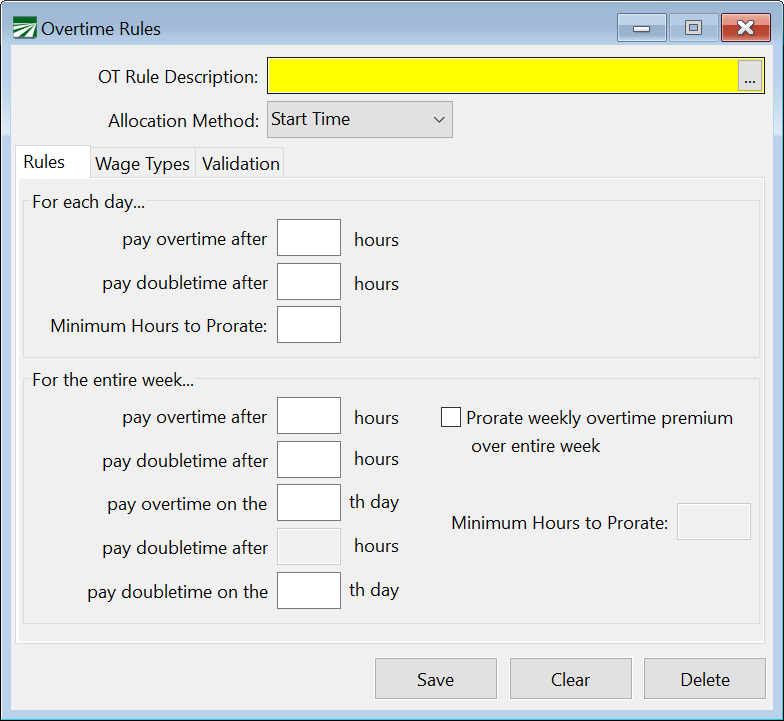 The Overtime Rules feature allows you to enter all hourly wages using the Regular Hours (RH) wage type, and then have the program determine which employees should be paid overtime and/or double-time wages. Overtime and double-time pay is based on limits defined for each day, the entire week or how many days the employee has worked.